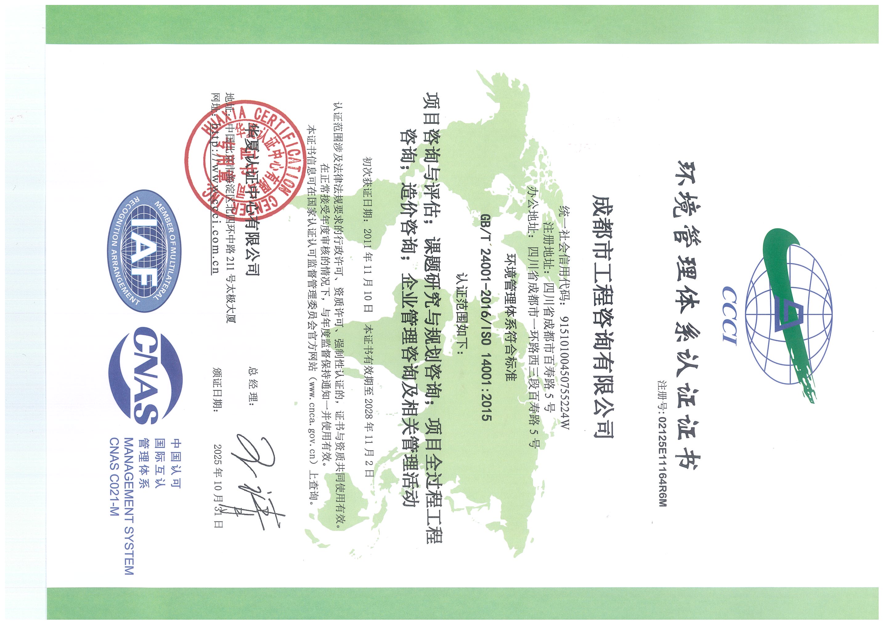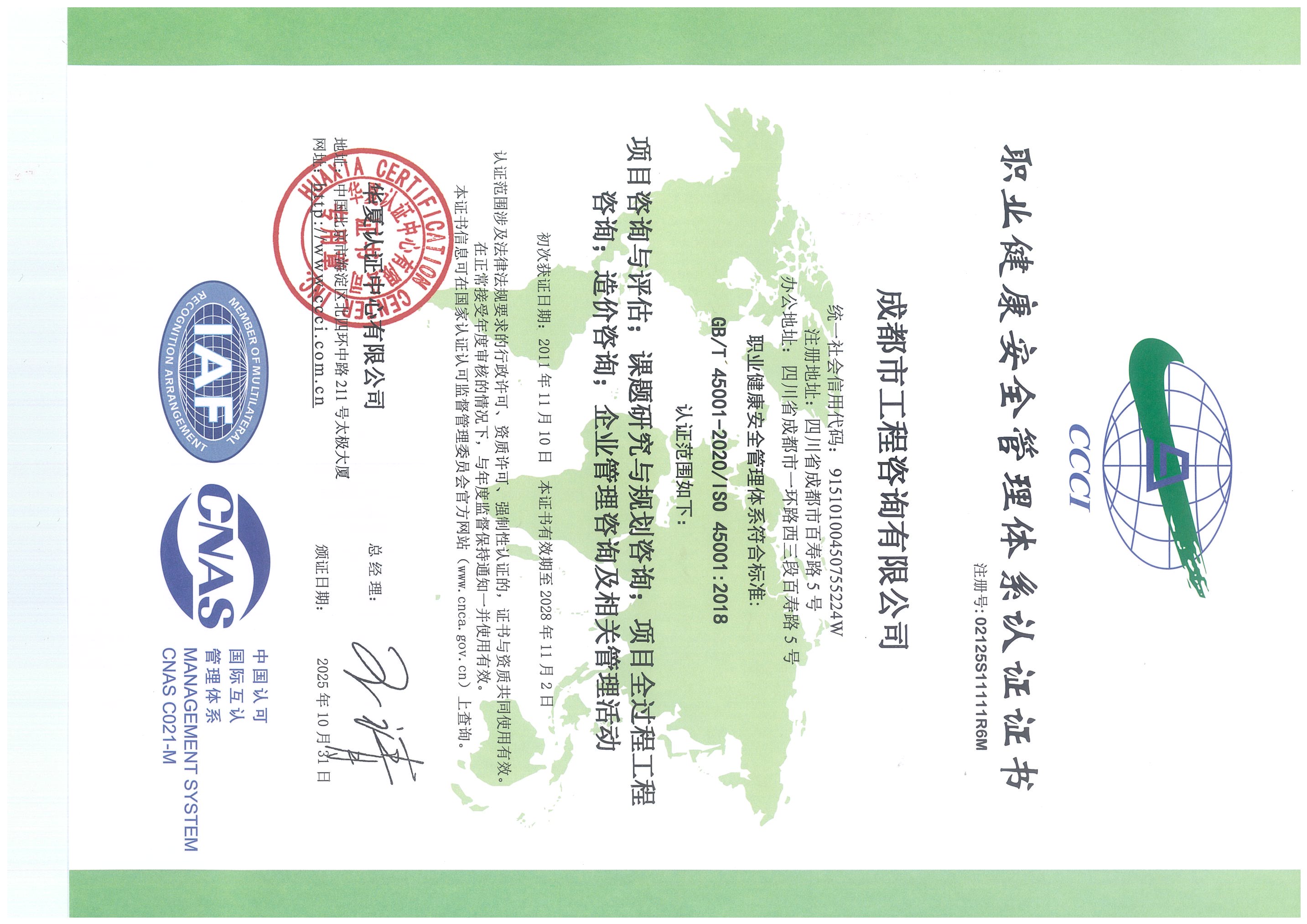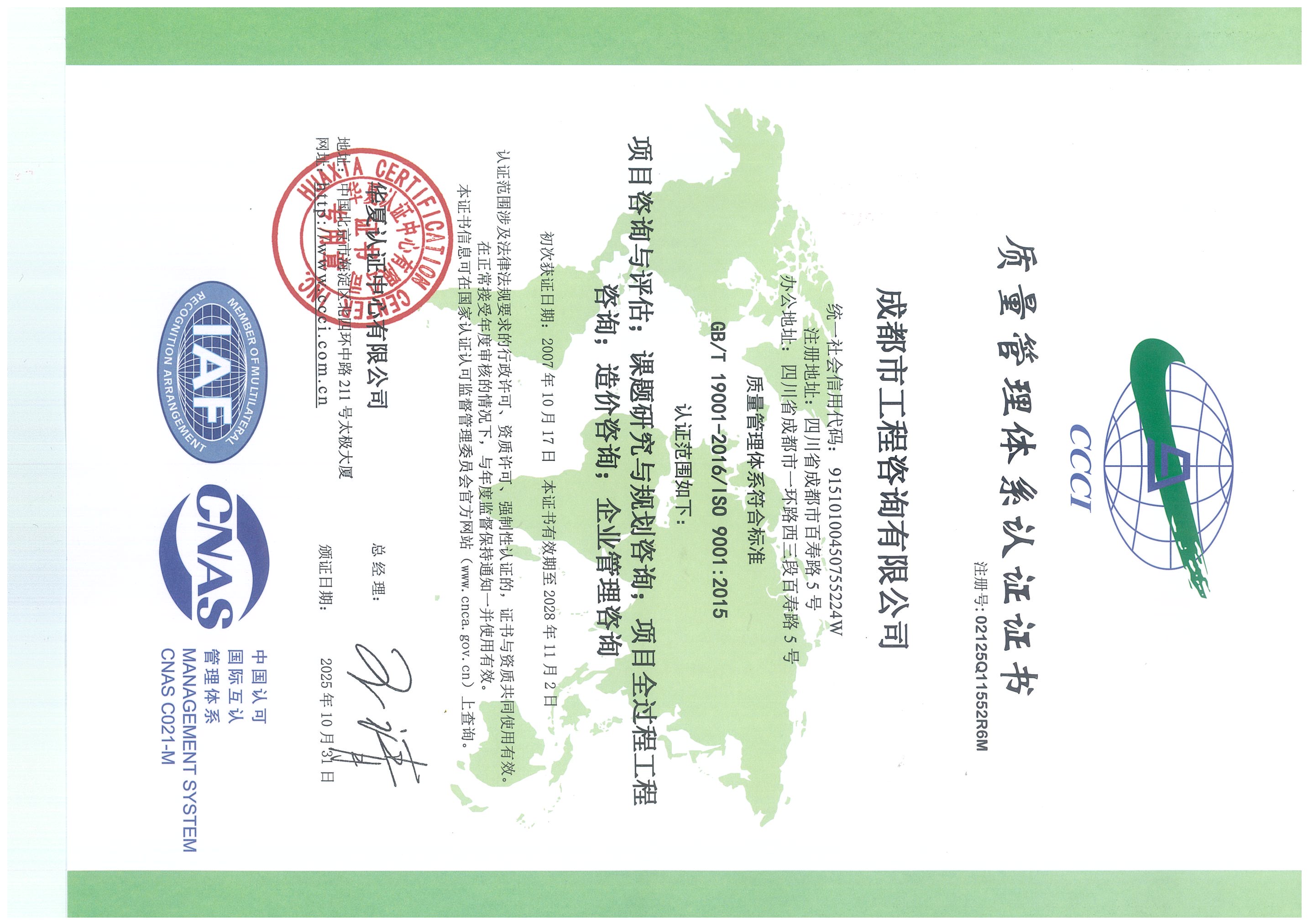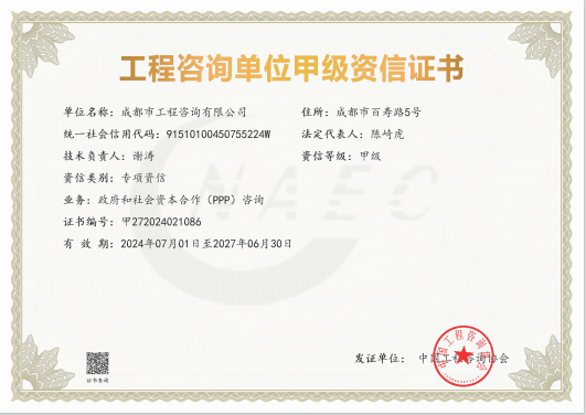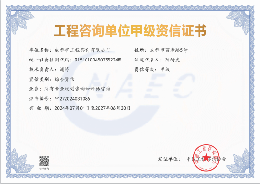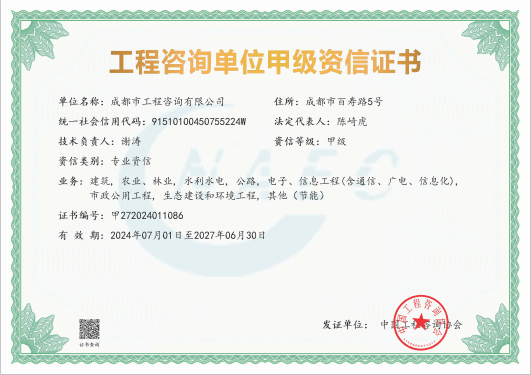 公司擁有工程咨詢甲級綜合資信、甲級專業(yè)資信和PPP甲級專項資信三項甲級資信證書和工程造價資質(zhì)。甲級綜合資信由建筑,水利水電,農(nóng)業(yè)、林業(yè),電子、信息工程(含通信、廣電、信息化),市政公用工程,生態(tài)建設(shè)和環(huán)境工程,公路,其他(節(jié)能)8個甲級專業(yè)資信和電力(含火電、水電、核電、新能源),輕工、紡織,水文地質(zhì)、工程測量、巖土工程,建材,鐵路、城市軌道交通,其他(土地整理)和其他(旅游工程)7個其他專業(yè)組成。公司現(xiàn)已通過了GB/T19001-2016/ISO9001:2015質(zhì)量管理體系、GB/T24001-2016/ISO14001:2015環(huán)境管理體系和GB/T45001-2020/ISO45001:2018職業(yè)健康安全管理體系認(rèn)證。公司目前是四川省內(nèi)唯一同時持有甲級綜合資信、甲級專業(yè)資信和PPP甲級專項資信證書的綜合性咨詢機(jī)構(gòu),是四川省及成都市發(fā)展改革部門以及天府新區(qū)、東部新區(qū)、高新區(qū)、武侯區(qū)等20余個區(qū)(市)縣的政府投資項目咨詢服務(wù)機(jī)構(gòu)。